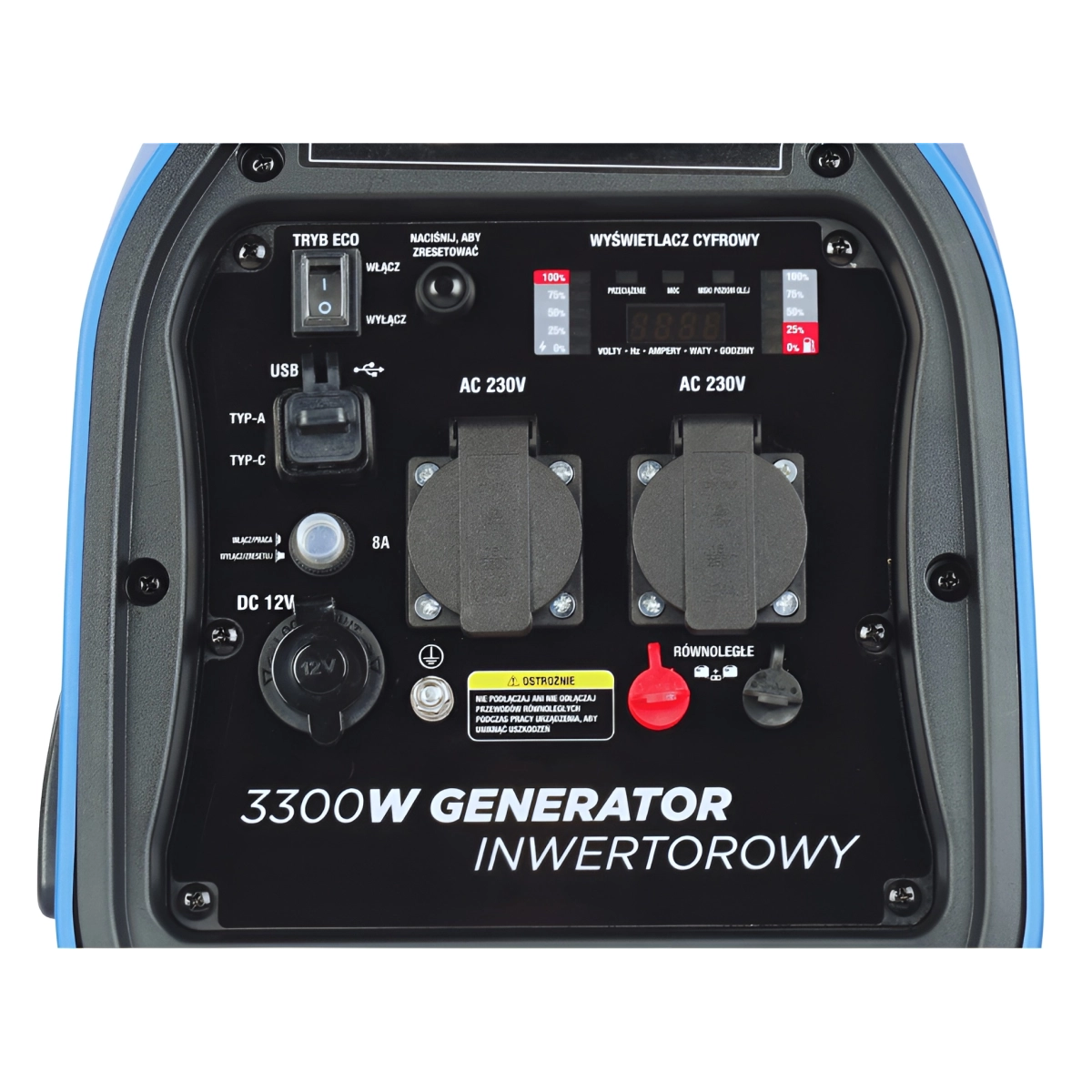 ⭐ Wyświetlacz cyfrowy: Tak (wskazuje napięcie, częstotliwość, moc, procent obciążenia i poziom paliwa)